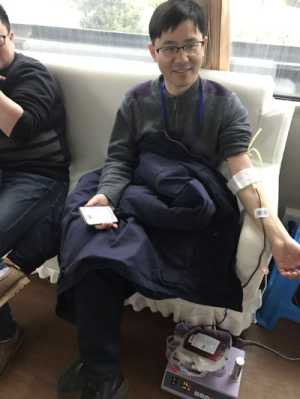 “小湯,今天你又來啦,這次可不能再暈倒喔”,正坐在椅子上采血的我見到本部門的小湯進來檢查血樣就與他開玩笑,小湯也不示弱“去年是第一次,沒有經(jīng)驗,現(xiàn)在讓我站著獻也沒事”,小湯躺下身子繼續(xù)說“我比較胖,今天抽400CC”,接近目標時,小湯的額頭上滲出了些許汗珠,醫(yī)生見狀,忙問“覺得不舒服嗎”,小湯堅定回答:“沒事,抽到400CC”。