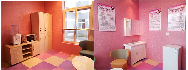 “愛心母嬰室”設(shè)置在活動(dòng)室二樓,面積11平方米,可容納4人同時(shí)哺乳。母嬰室內(nèi)設(shè)施完善,配備冰箱,飲水機(jī),儲(chǔ)物柜,微波爐,洗手池,宣傳標(biāo)識牌,軟座沙發(fā)等現(xiàn)代化設(shè)施,可以為哺乳媽媽們提供一個(gè)干凈衛(wèi)生、溫馨舒適、安全私密的哺乳環(huán)境。