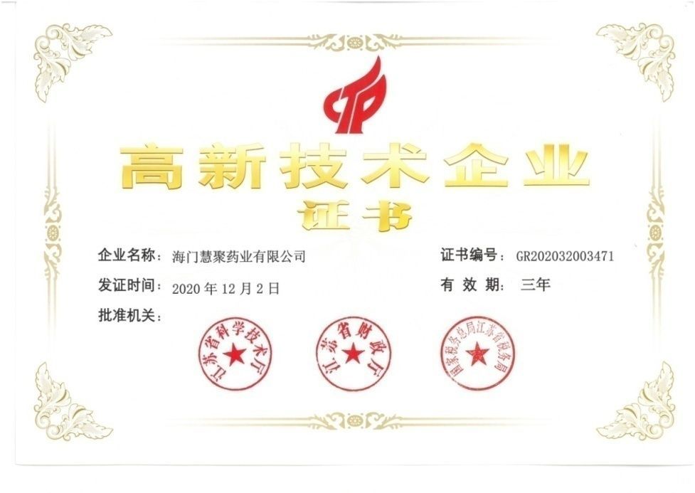 近日,慧聚藥業(yè)收到由江蘇省科技廳、江蘇省財政廳、國家稅務(wù)總局江蘇省稅務(wù)局聯(lián)合頒發(fā)的《高新技術(shù)企業(yè)證書》。公司自2008年首次通過“高新技術(shù)企業(yè)”認定,這是慧聚藥業(yè)連續(xù)第5次獲得此項資質(zhì)。此次通過高新技術(shù)企業(yè)的再認定,是對公司技術(shù)研發(fā)實力和科技成果轉(zhuǎn)化能力的肯定,將進一步激勵公司持續(xù)加大科研投入,激發(fā)公司自主創(chuàng)新的熱情,在引入高精尖人才、提升科技創(chuàng)新能力、打造核心產(chǎn)品等方面持續(xù)發(fā)力,充分發(fā)揮高新技術(shù)企業(yè)的優(yōu)勢和引領(lǐng)作用。