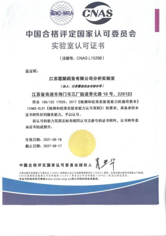 2021年8月18日,江蘇慧聚藥業(yè)有限公司通過審核,取得CNAS認(rèn)證證書。此次獲得CNAS審核,既是對(duì)分析實(shí)驗(yàn)室的技術(shù)實(shí)力及體系管理實(shí)力的認(rèn)可,也是慧聚藥業(yè)建設(shè)國(guó)際一流實(shí)驗(yàn)室道路上的關(guān)鍵一步。面向未來(lái),分析實(shí)驗(yàn)室將繼續(xù)秉承“數(shù)據(jù)準(zhǔn)確、運(yùn)轉(zhuǎn)高效、行為公正、態(tài)度嚴(yán)謹(jǐn)”的質(zhì)量方針,嚴(yán)格按照法規(guī)要求、體系要求、國(guó)際標(biāo)準(zhǔn)、國(guó)內(nèi)標(biāo)準(zhǔn)認(rèn)真控制各檢測(cè)環(huán)節(jié),發(fā)揮各職能部門功能,完成各項(xiàng)檢測(cè)任務(wù),以專業(yè)的技術(shù)支持,確保檢測(cè)報(bào)告的準(zhǔn)確及時(shí),持續(xù)提升客戶滿意度。